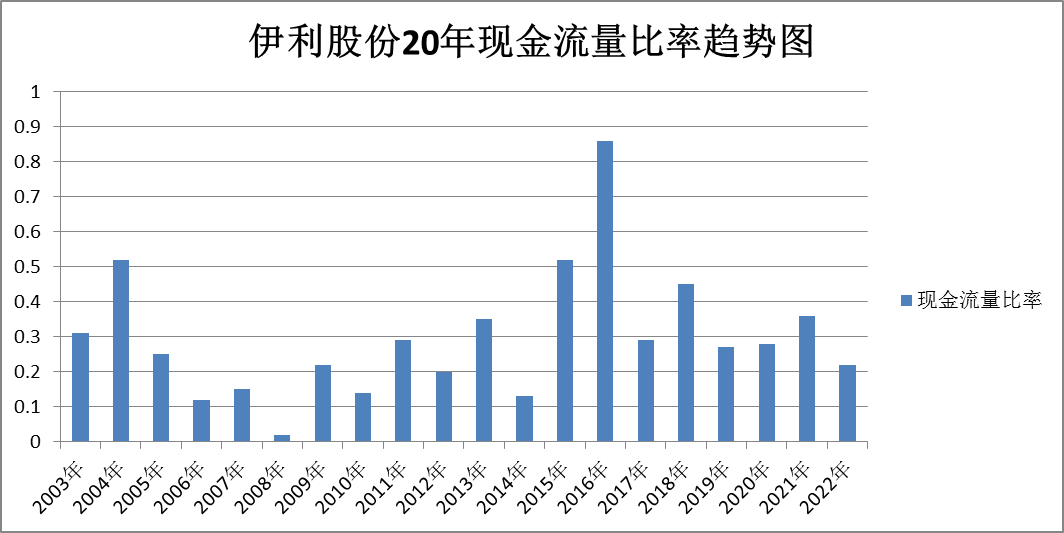 2003年-2022年现金流量比率基本上都在0.5以下。企业财务状况