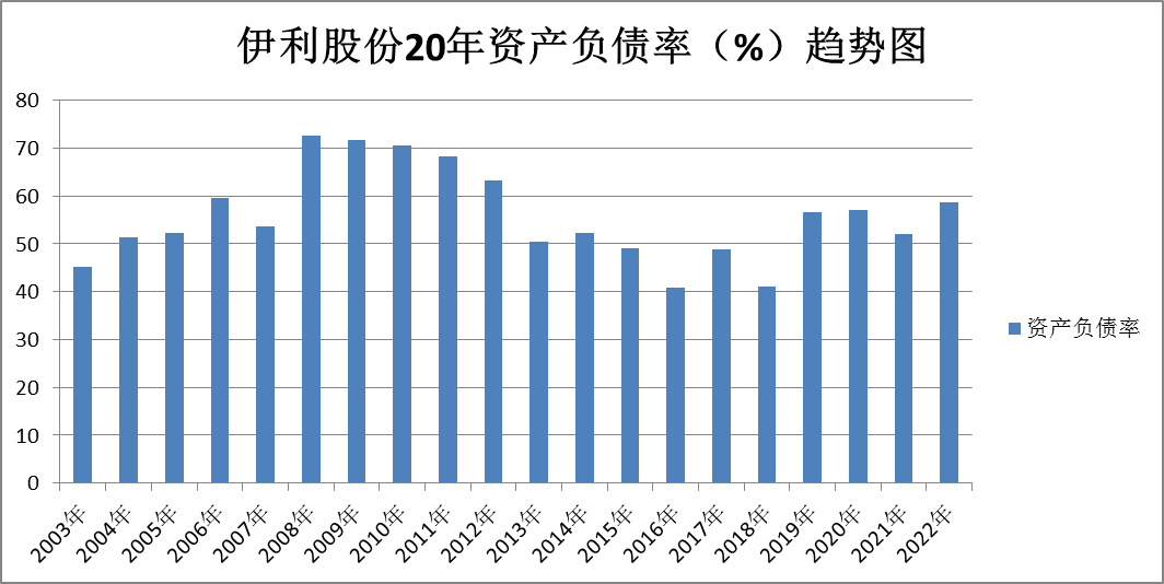 2003年-2022年资产负债率总的趋势图上下波动。资产负债率有的年份在60%以上。