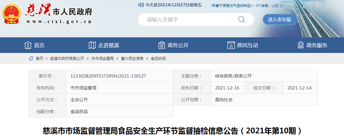 中国质量新闻网讯 近日,浙江省慈溪市市场监督管理局发布食品安全生产环节监督抽检信息公告(2021年第10期)。