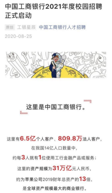工商银行8月25日公告称,为积极响应国家“六稳”“六保”政策号召,今年校园招聘规模达到1.8万人。2021年应届毕业生与因疫情影响未落实工作的2020年高校毕业生均可参与本年校招。