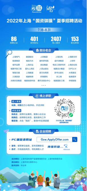 为积极响应国务院国资委关于国资央企促进高校毕业生就业工作和本市“海聚英才”云选会有关部署要求,上海市国资委联合上海市教委拟于7-8月持续开展2022年上海“国资骐骥”夏季招聘活动。截至目前,已有86家本市地方国有企业报名参与,发布职位401个,计划招聘2407人,相关岗位信息持续更新中……