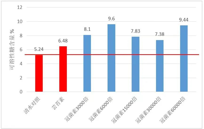 近几年的极端天气也越来越多,这让农户们损失惨重,头疼不已,特别每年的倒春寒造成的冻害。甜冠用于葡萄后,能够有效帮助葡萄减少冻害和冷害带来的损伤:一是甜冠能够显著提高作物体内的可溶性糖含量,帮助提高作物的抗低温能力;二是甜冠作为信号分子能够激发作物的逆境响应机制,分泌相关抗冻抗寒蛋白,有效抵御低温带来的损伤和风险,有效减少低温对葡萄生长的伤害。
