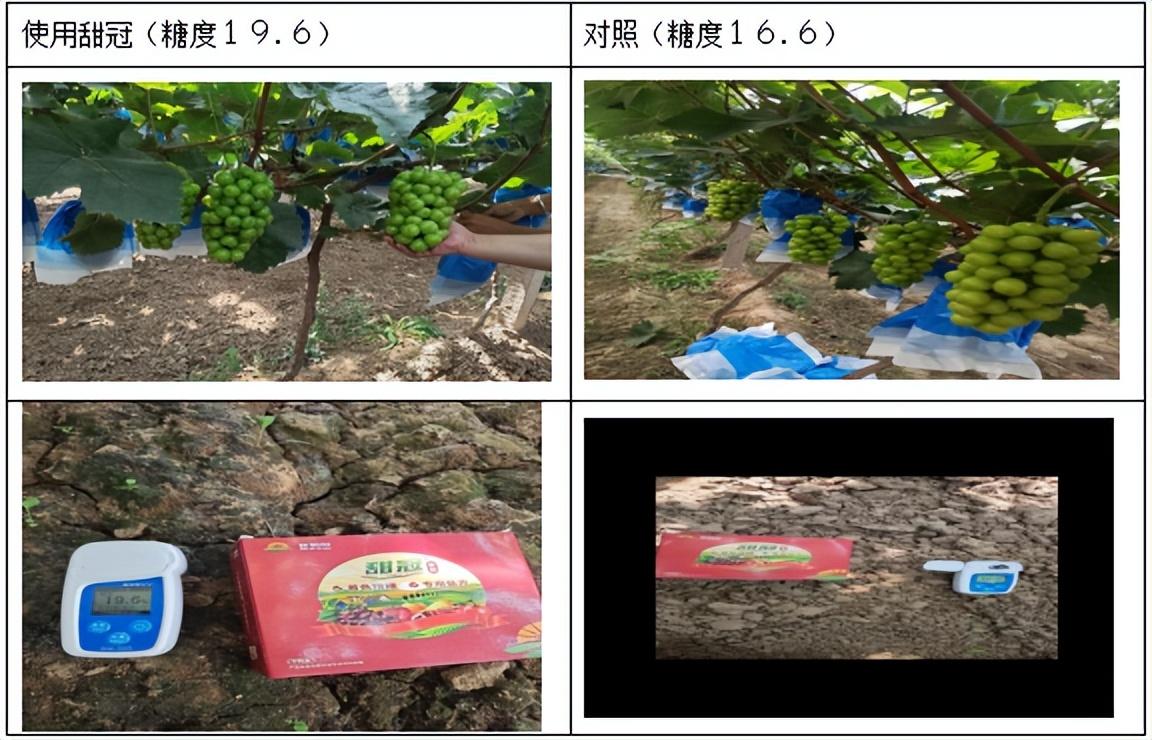 对照相比,使用甜冠后,红提葡萄转色快而且着色均匀,提早上市7天以上
